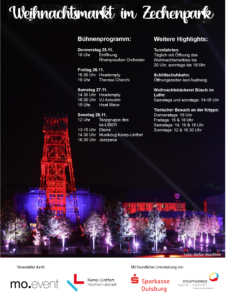 Am Donnerstag, den 25. November um 18 Uhr startet die Premiere des Weihnachtsmarktes im Zechenpark. Gegen 18:30 Uhr wird Bürgermeister Prof. Dr. Landscheidt den Markt offiziell mit einer kleinen Ansprache eröffnen. Dann hoffen die Veranstalter mo.event und die Stadt Kamp-Lintfort auf zahlreiche Gäste, die die Atmosphäre genießen und zu einem gelungenen Start des Weihnachtsmarkts beitragen. An dieser Stelle geht auch nochmal ein großer Dank an die Sponsoren des Weihnachtsmarkts: Die Stadtwerke Kamp-Lintfort und die Sparkasse Duisburg, die durch großes Engagement zur Umsetzung des Bühnenprogramms auf dem neuen Weihnachtsmarkt beitragen.
